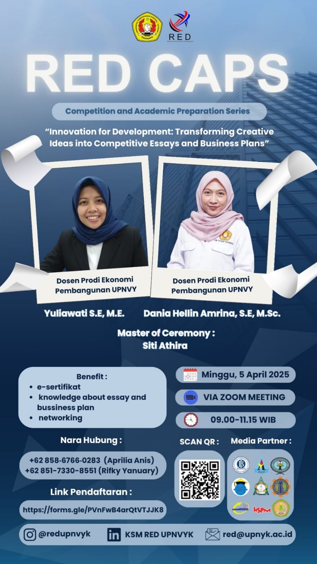 Kegiatan RED CAPS (Competition and Academic Preparation Series) menghadirkan sesi pelatihan yang berfokus pada peningkatan kemampuan mahasiswa dalam menulis esai dan menyusun business plan secara kompetitif. Pada sesi pertama, Dania Hellin Amrina, S.E., M.Sc menyampaikan materi mengenai teknik penulisan esai yang efektif, mulai dari pemahaman dasar esai, struktur yang logis, hingga strategi menyusun argumen yang persuasif. Peserta diajak memahami bahwa esai tidak hanya sekadar menyampaikan opini, tetapi juga harus didukung data serta disusun secara sistematis agar mampu meyakinkan pembaca.